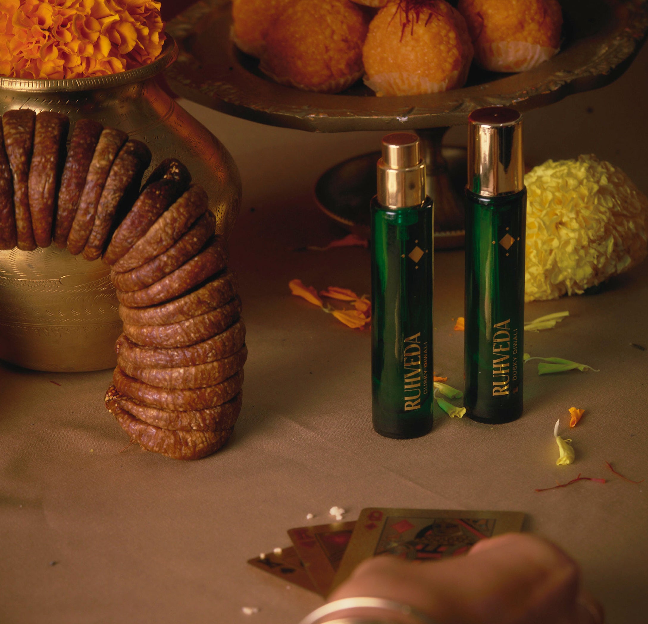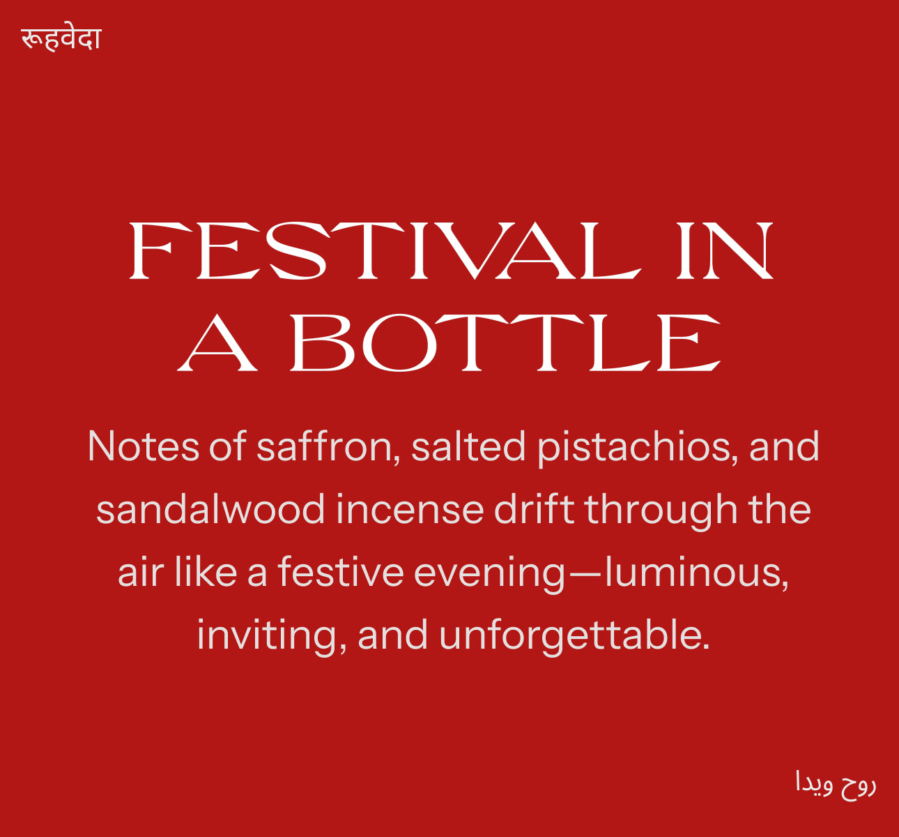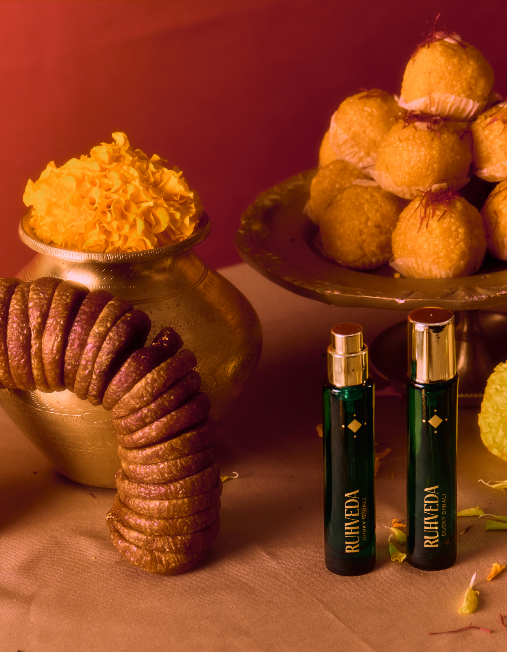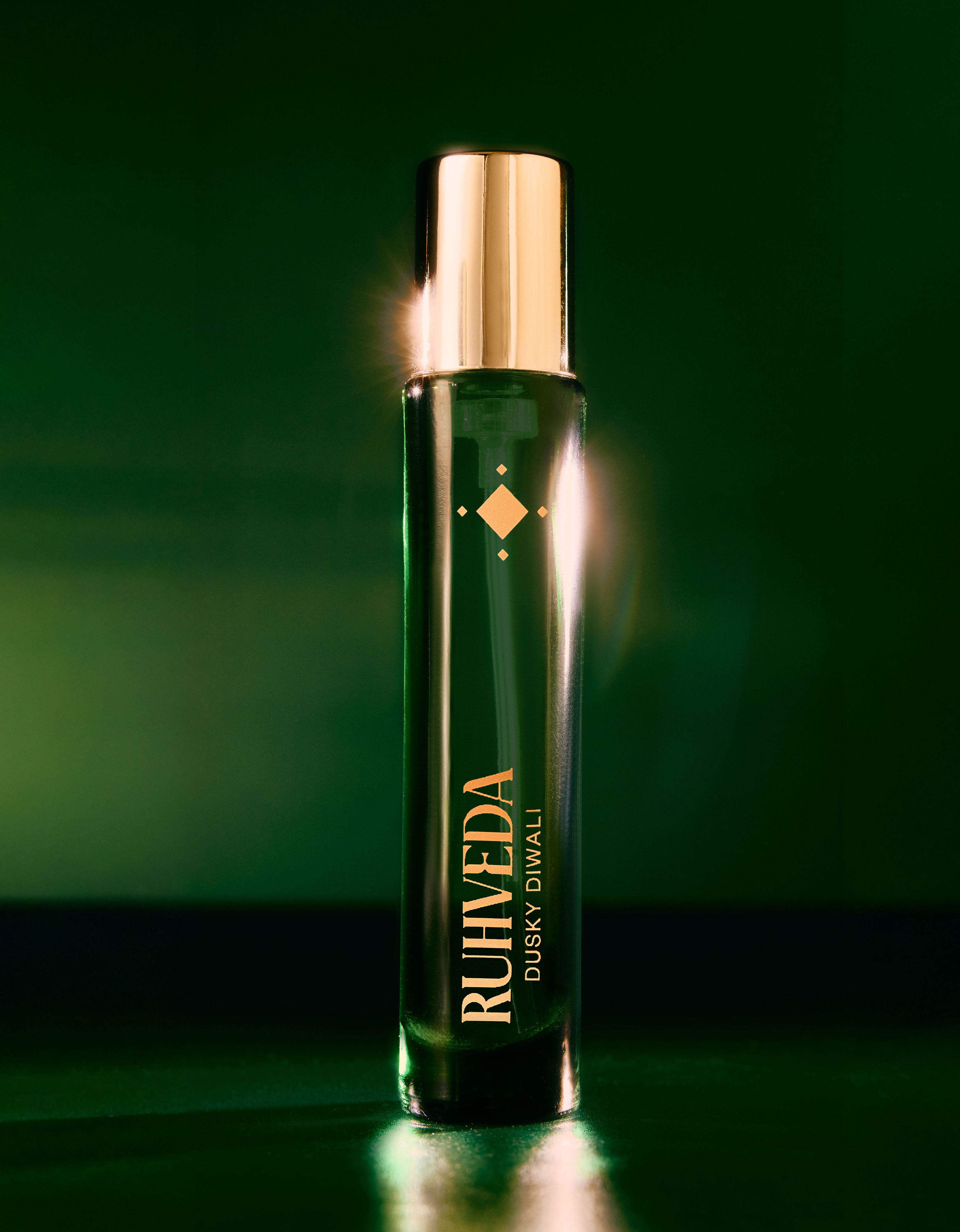 Dusky Diwali is a warm, luminous scent that feels like a celebration– rich with sweetness, spice, and warmth. It opens with the glow of saffron, melts into the nutty richness of salted pistachios, and finishes with the gentle warmth of sandalwood incense that lingers softly on the skin.