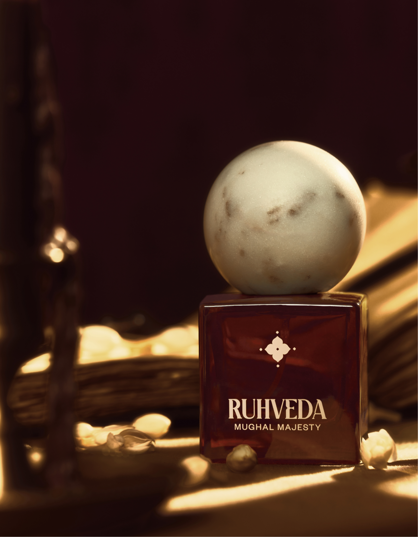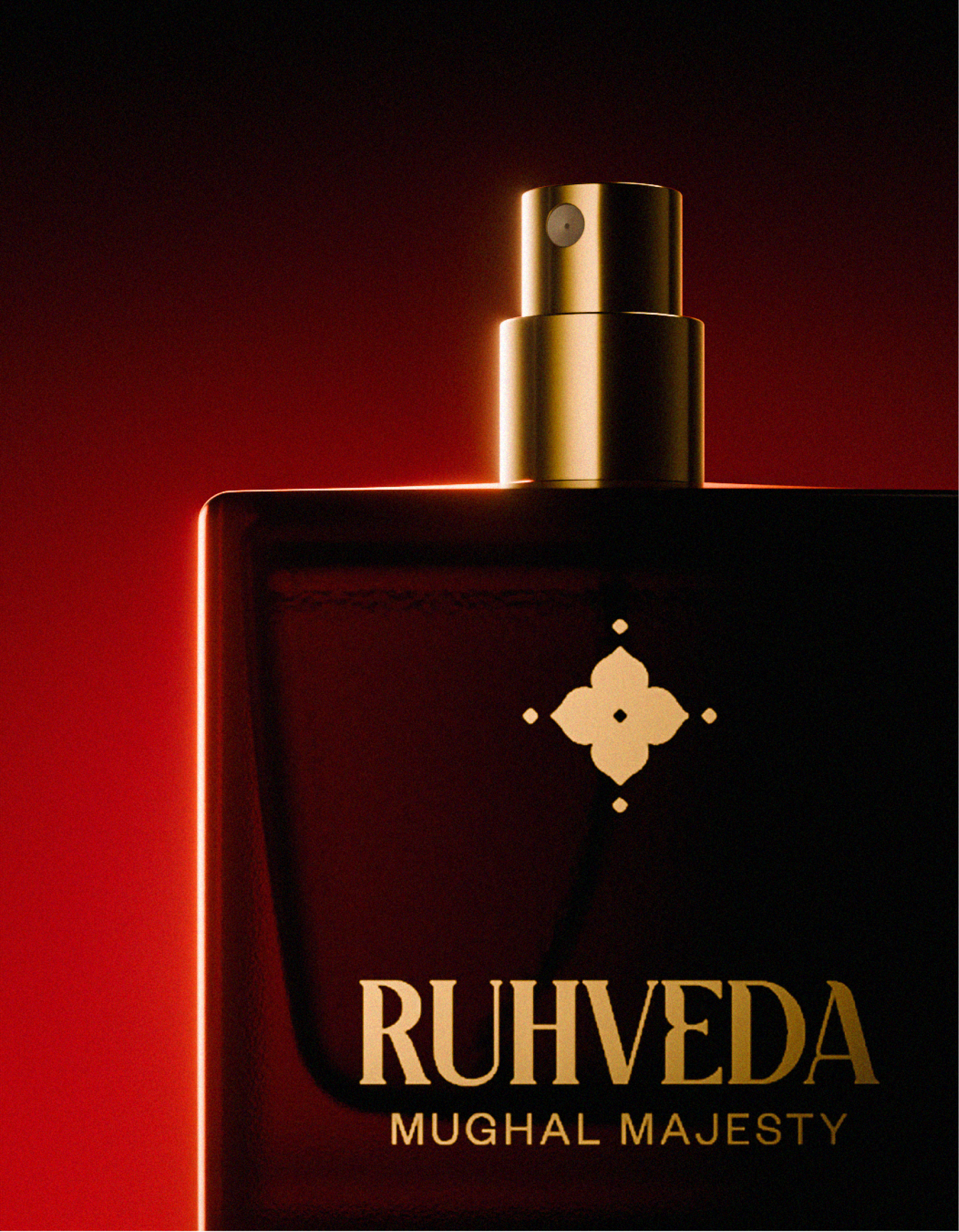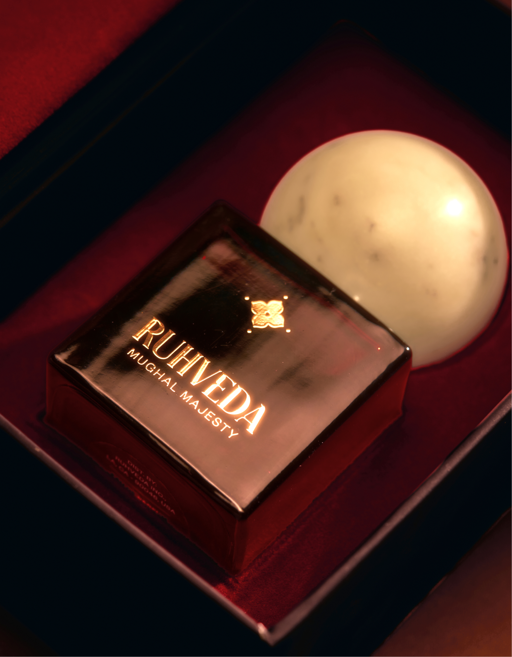 The design of Mughal Majesty is inspired by the grandeur of India’s Mughal era—where art, architecture, and fragrance were intertwined expressions of power and beauty. The bottle’s deep brown hue mirrors the richness of leather and amber, while the white marble cap, hand-carved by artisans in Rajasthan, nods to the timeless elegance of the Taj Mahal. The floral motif, drawn from Mughal palace carvings, symbolizes balance between strength and grace. Every detail reflects quiet luxury, turning the bottle into an heirloom object that carries the weight of history with a modern sensibility.
